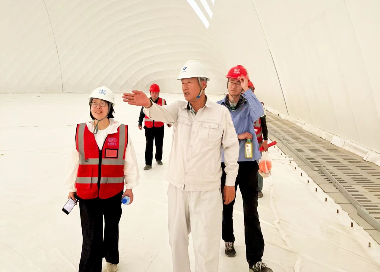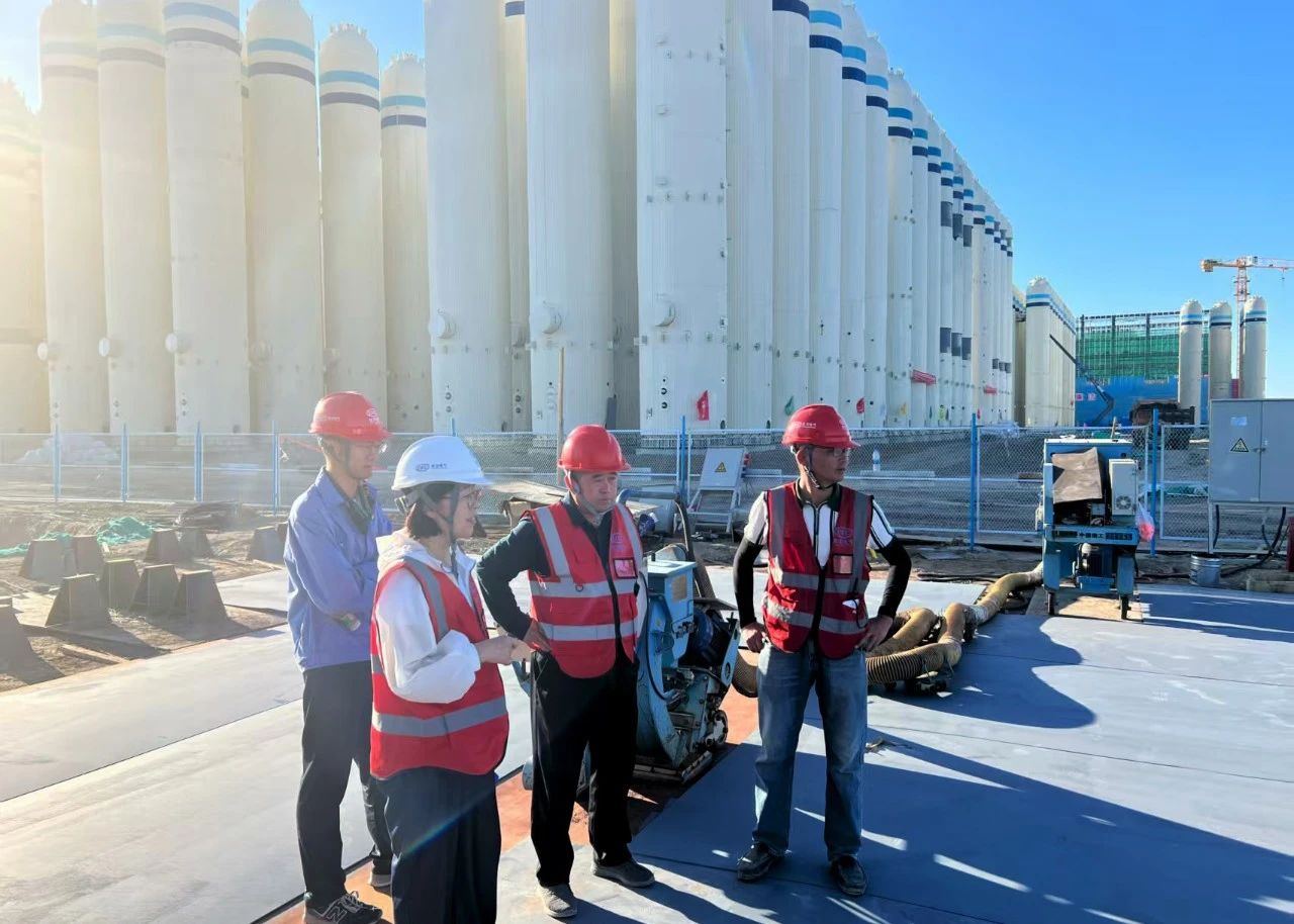 隨后,劉月琴總工一行在業主的帶領下深入主發電機房和氣包內部了解系統工作原理和關鍵技術,儲存低壓二氧化碳的巨型膠囊狀氣包、高聳林立的高壓液態二氧化碳儲能罐以及四周密布的光伏發電板,現場震撼力十足,切實感受到祖國新能源發展的宏圖偉業。劉月琴由衷感慨:“公司能夠參與建設全球最大二氧化碳儲能發電項目,作為其中一員深感自豪。”她再次叮囑項目部同事務必嚴要求、高質量完成這項偉大任務。